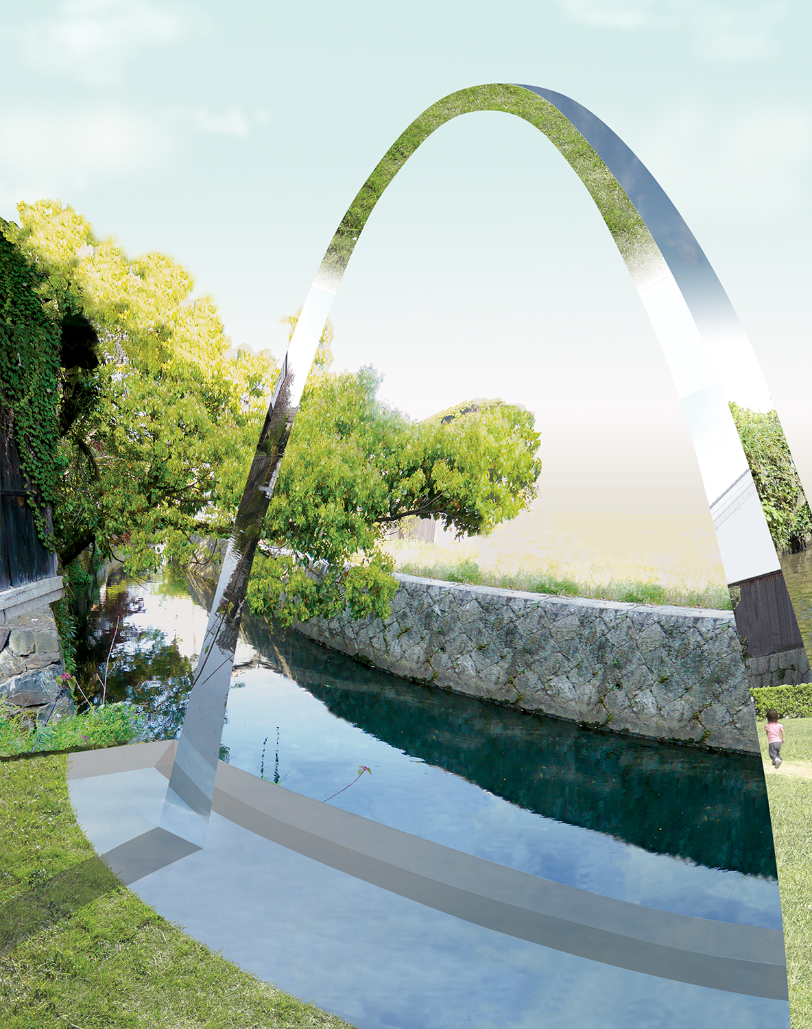 ガラスのプリズムが視線を屈折させる原理を利用し、見る方向と違う風景をうつしだすガラスアーチを設計した。公園に集う人々の視線の位置や高さ、方向により、異なるまちなみをうつしだす。歴史的な街並み、どこまでも広がる水田や深い雪などの四季折々の風景、長浜の今とこれからをうつし続ける「時」をテーマにした作品
