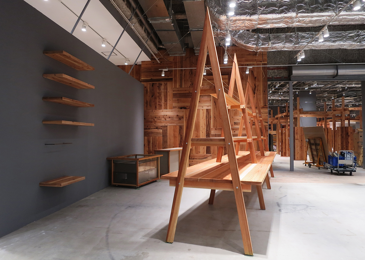 The 6m wide, 3m high bread rack, designed to be visible from a distance in a secluded section of the vast shop, is expandable and can be connected to any extent by adding an A-shaped frame. In addition, the refrigerated showcases were recycled from storage by framing them with the same cedar wood as the bread shelves.